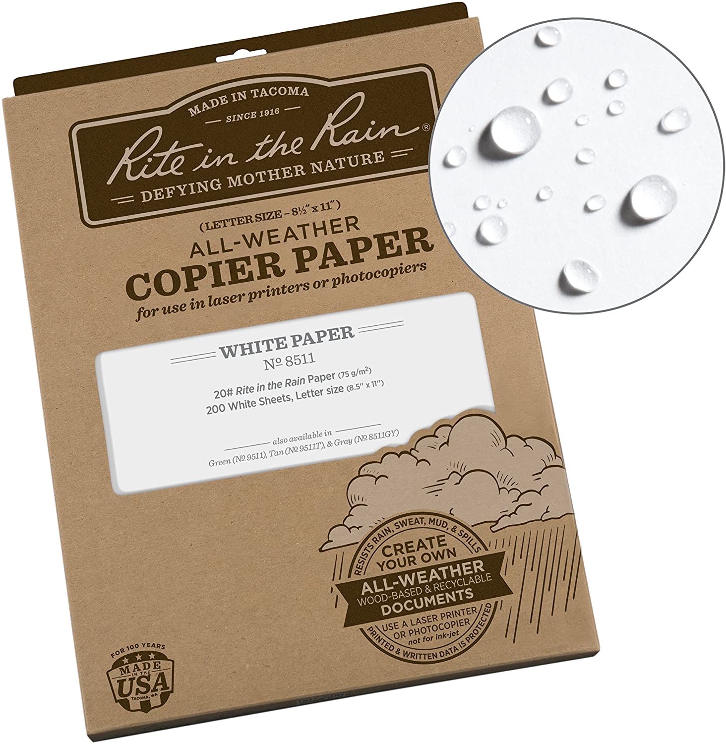 Protect your data with the go-to brand for weather-resistant writing materials. Copy or laser print your own all-weather forms, charts, maps, worksheets, permits, etc. with all-weather copier paper. 8-1/2"x 11", plain (no pattern). Fully recycleable. Comes in a pack of 200 sheets. Works with laser printers or photocopiers - do not use with inkjet printers.