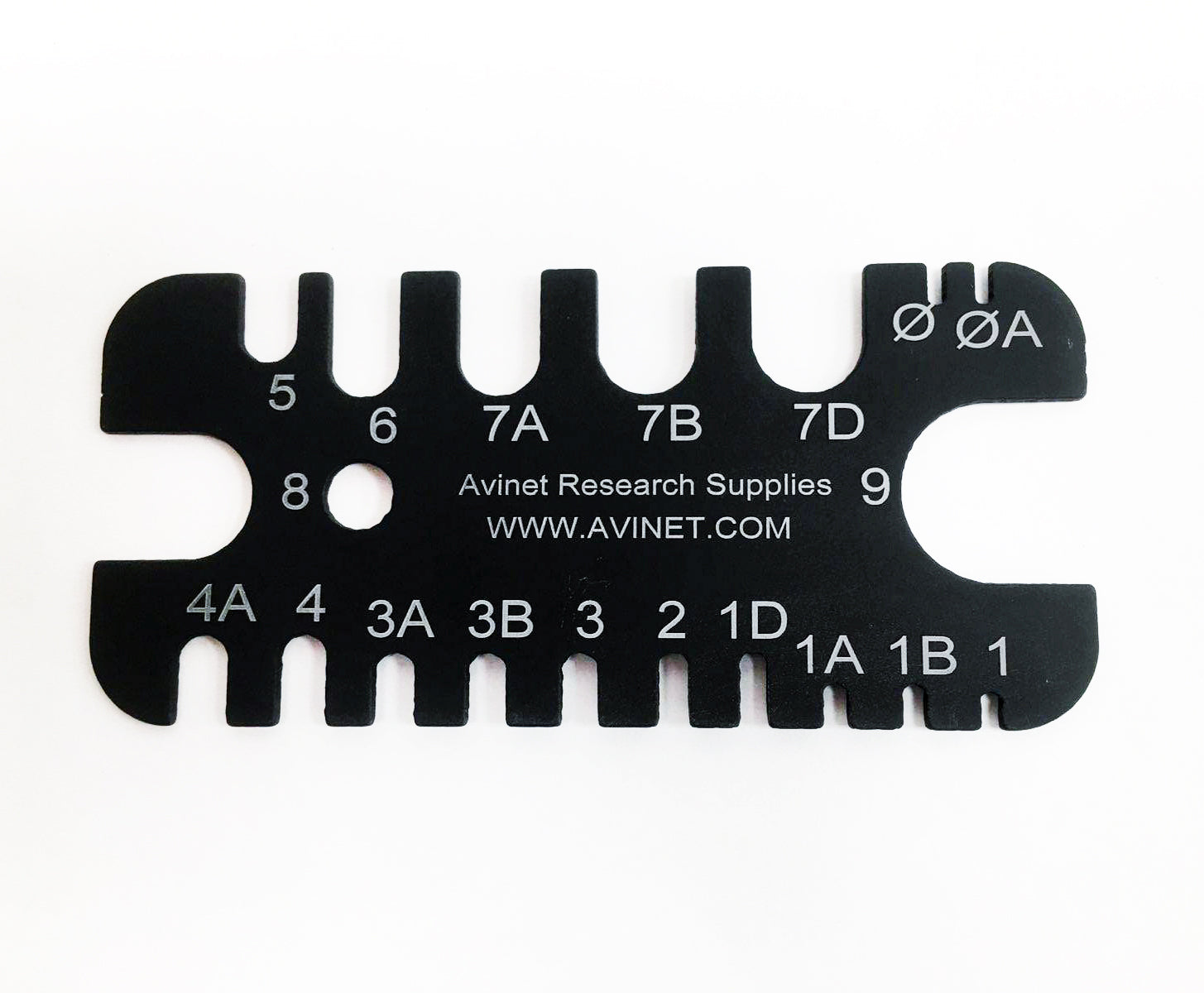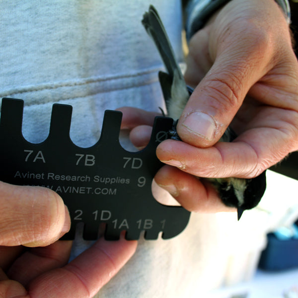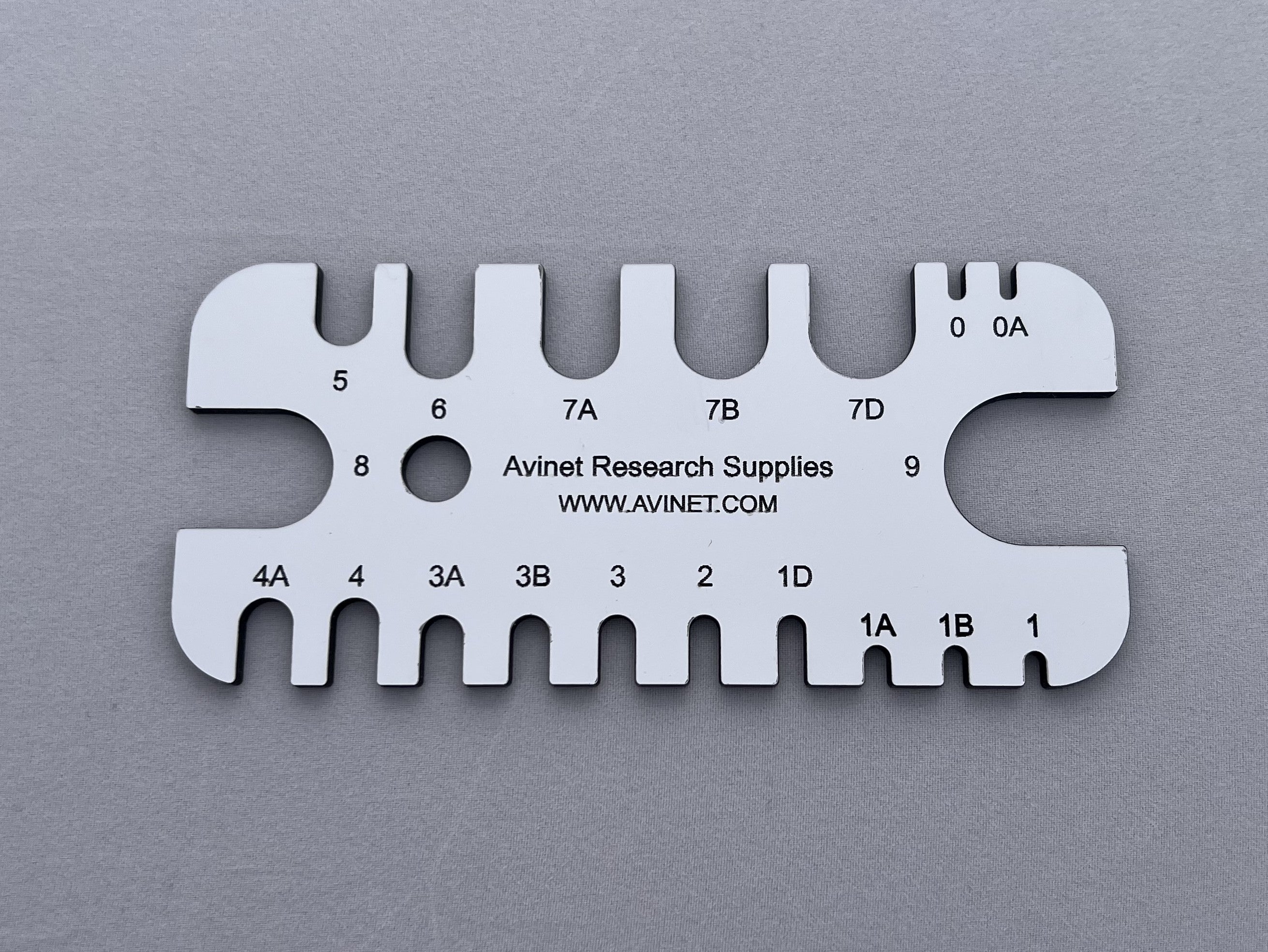 A leg gauge is an essential tool for every bander. Notches correspond to US band sizes and allow you to select the best fitting band. Available in two materials, brushed aluminum (black) and sturdy plastic (white). Dimensions of the aluminum gauge: 5 3/4" x 2.5", plastic gauge is 7"x4".