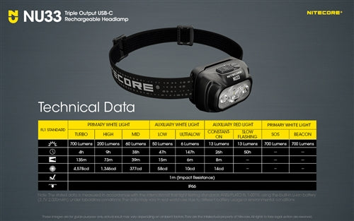 This NU33 is rated IP66 water resistant, features a bold new aerodynamic unibody design that efficiently dissipates heat and looks stylish to boot. The newly designed headband is skin-friendly and has large bright reflective strips to guarantee visibility and protection. 15% smaller than NU32, the lightweight NU33 takes the center stage as Nitecore's new all-rounder headlamp for night running, outdoor adventures, or camping.